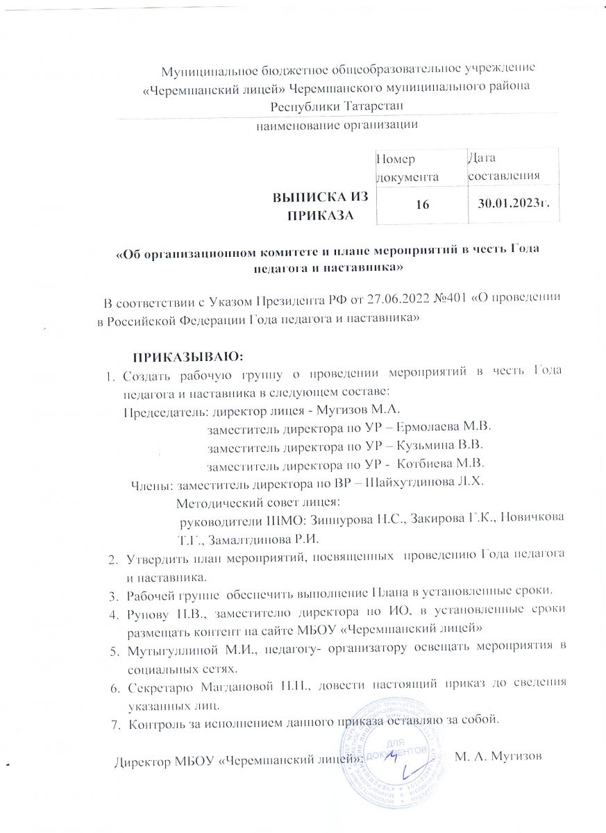 План мероприятий по проведению в МБОУ "Черемшанский лицей" Года педагога и наставника.