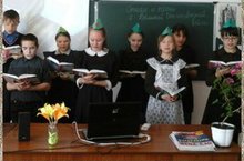 Учащиеся среднего звена репетируют военные песни для торжественного концерта, который будет проходить 8 мая, в сельском Доме культуры.