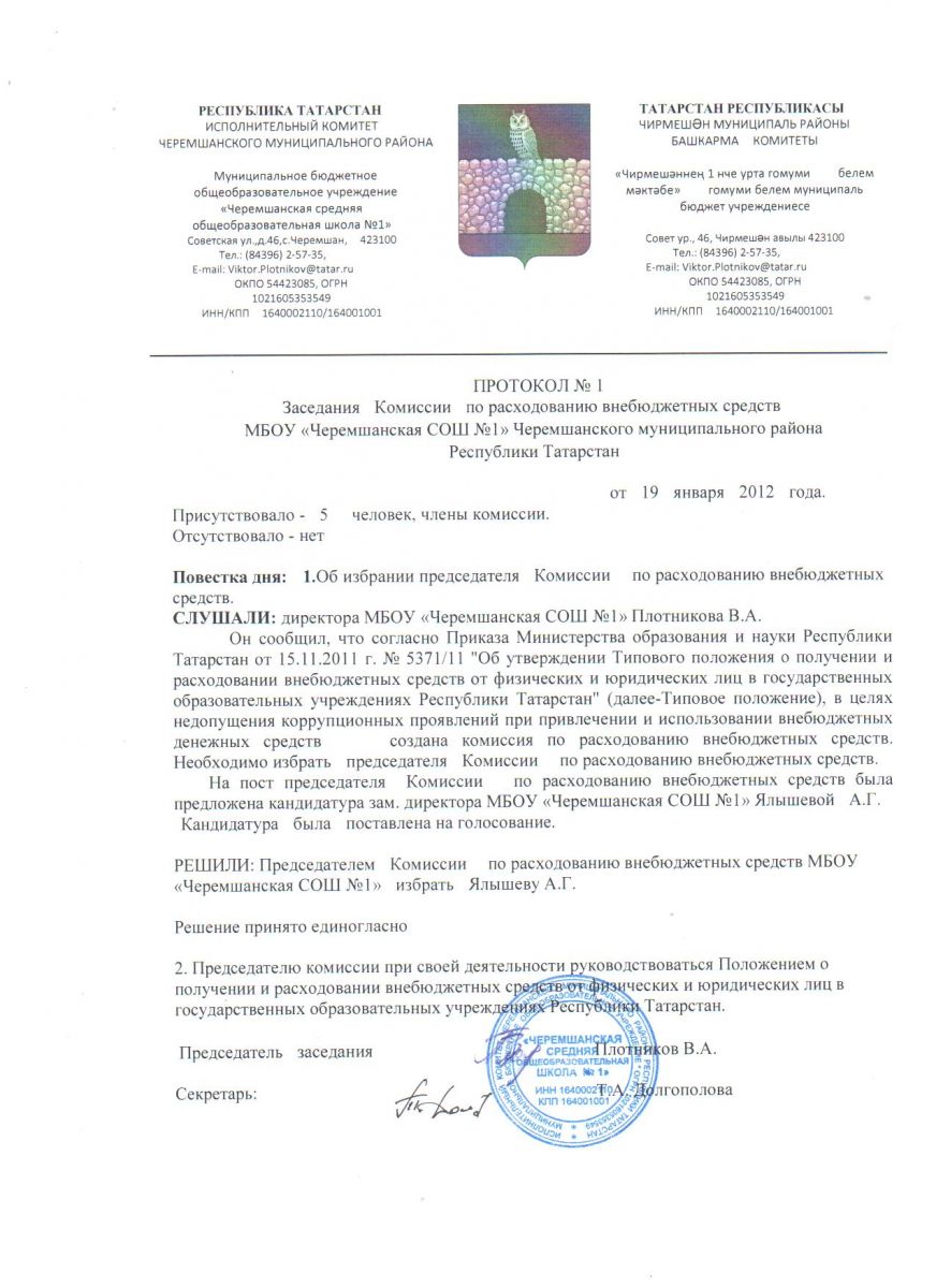 Протокол № 1 "Об избрании председателя Комиссии по расходованию внебюджетных средств