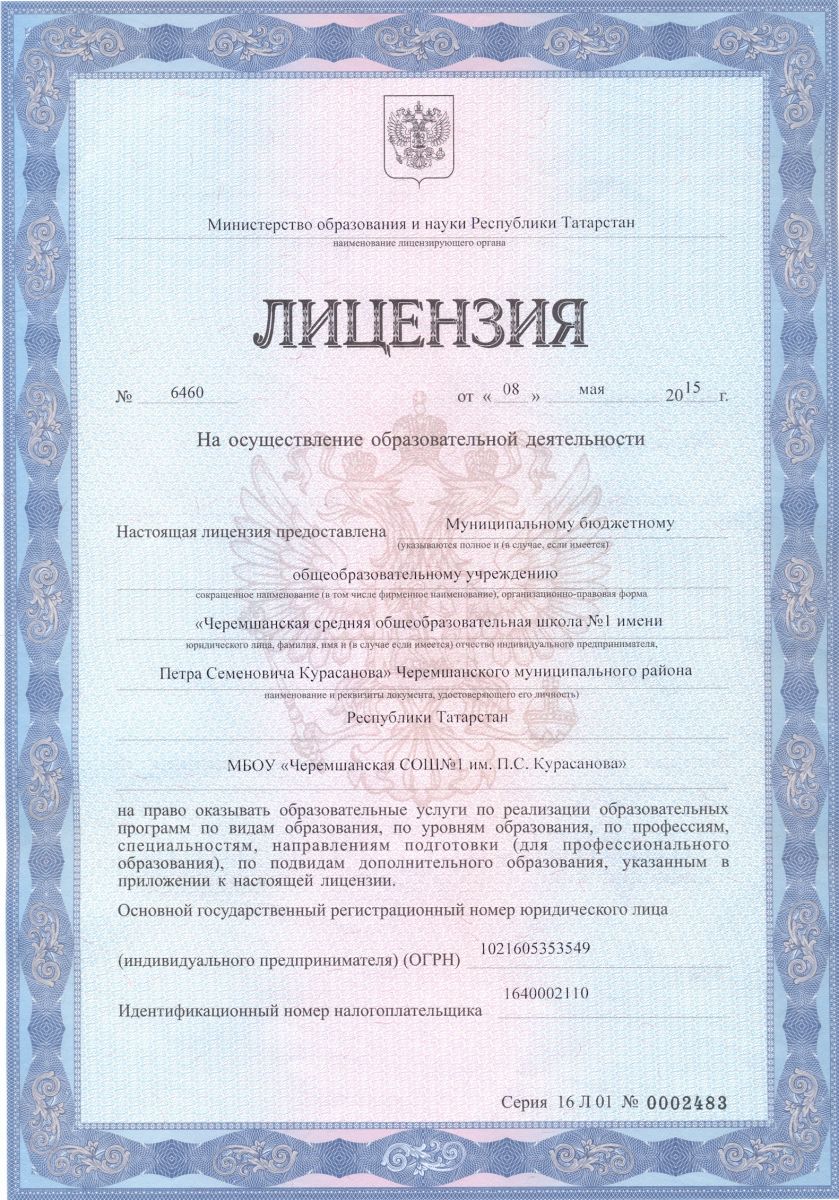 - Лицензия Черемшанской СОШ №1 им. П.С. Курасанова 2015г.