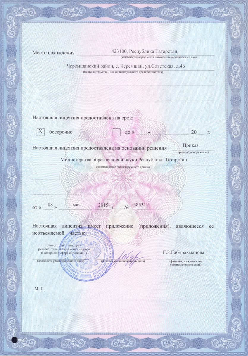 - Лицензия (оборотная сторона) Черемшанской СОШ №1 им. П.С. Курасанова 2015г.