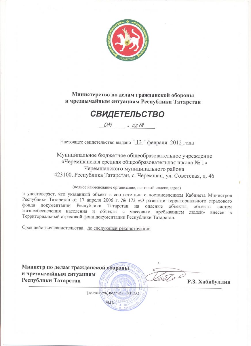 - Свидетельство ОМ-0218 от 13 февраля 2012 года о внесениии в Территориальный страховой фонд документации Республики Татарстан