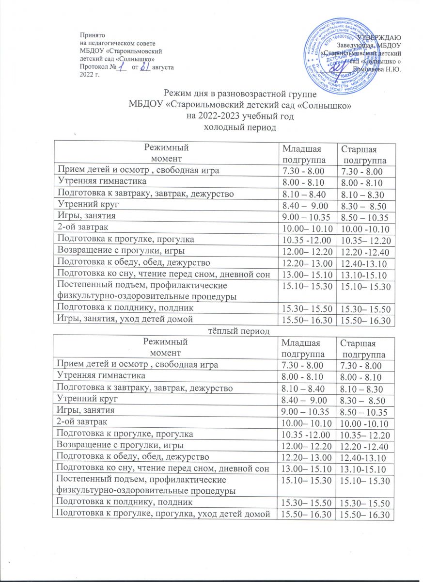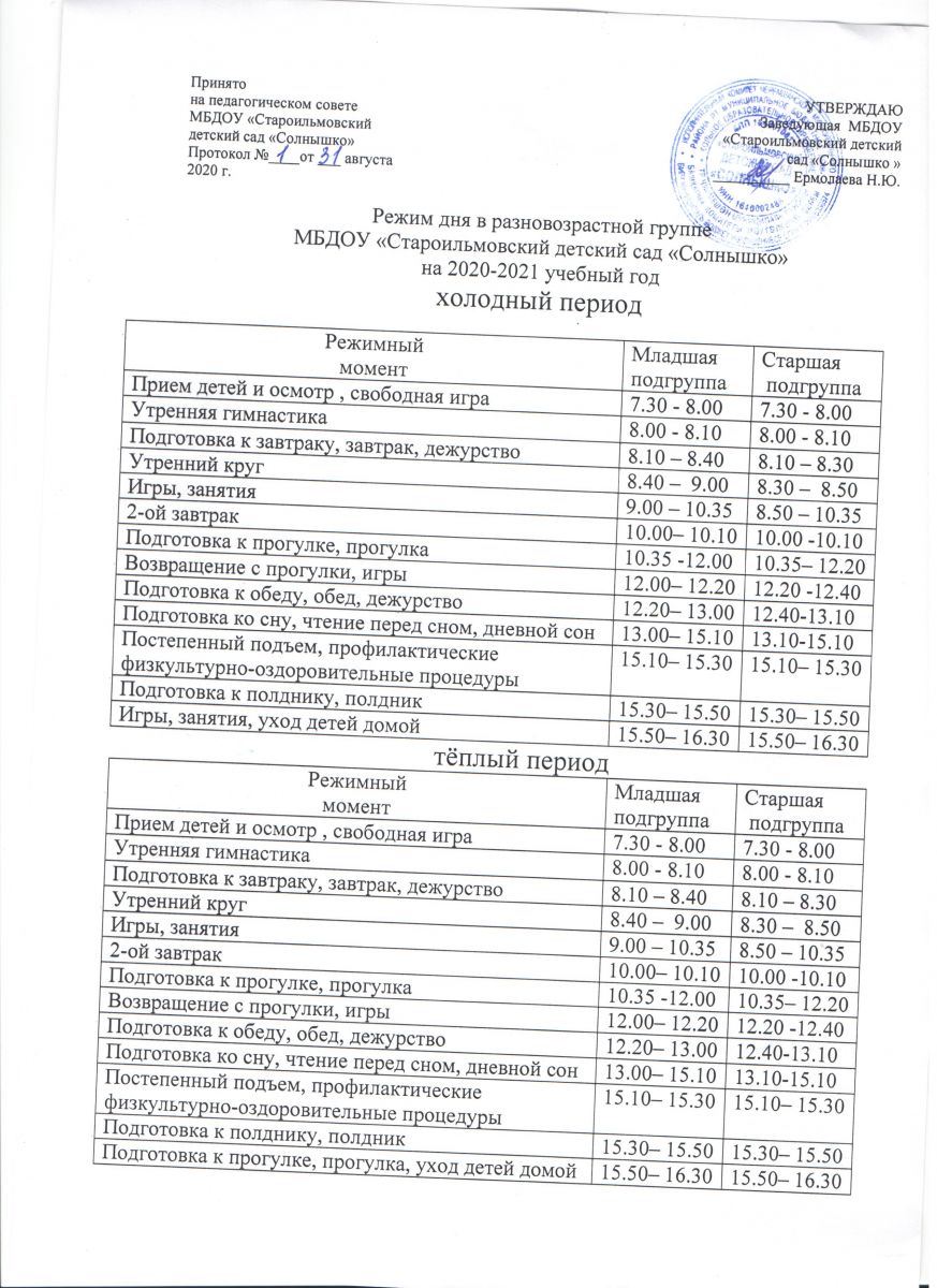 Режим дня в разновозрастной группе на 2020-2021 учебный год