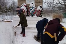 Ученики 7 класса и руководители вооружившись лопатами и метлой, очистили памятник. Ребята работали очень дружно, и закончили работу быстро. -