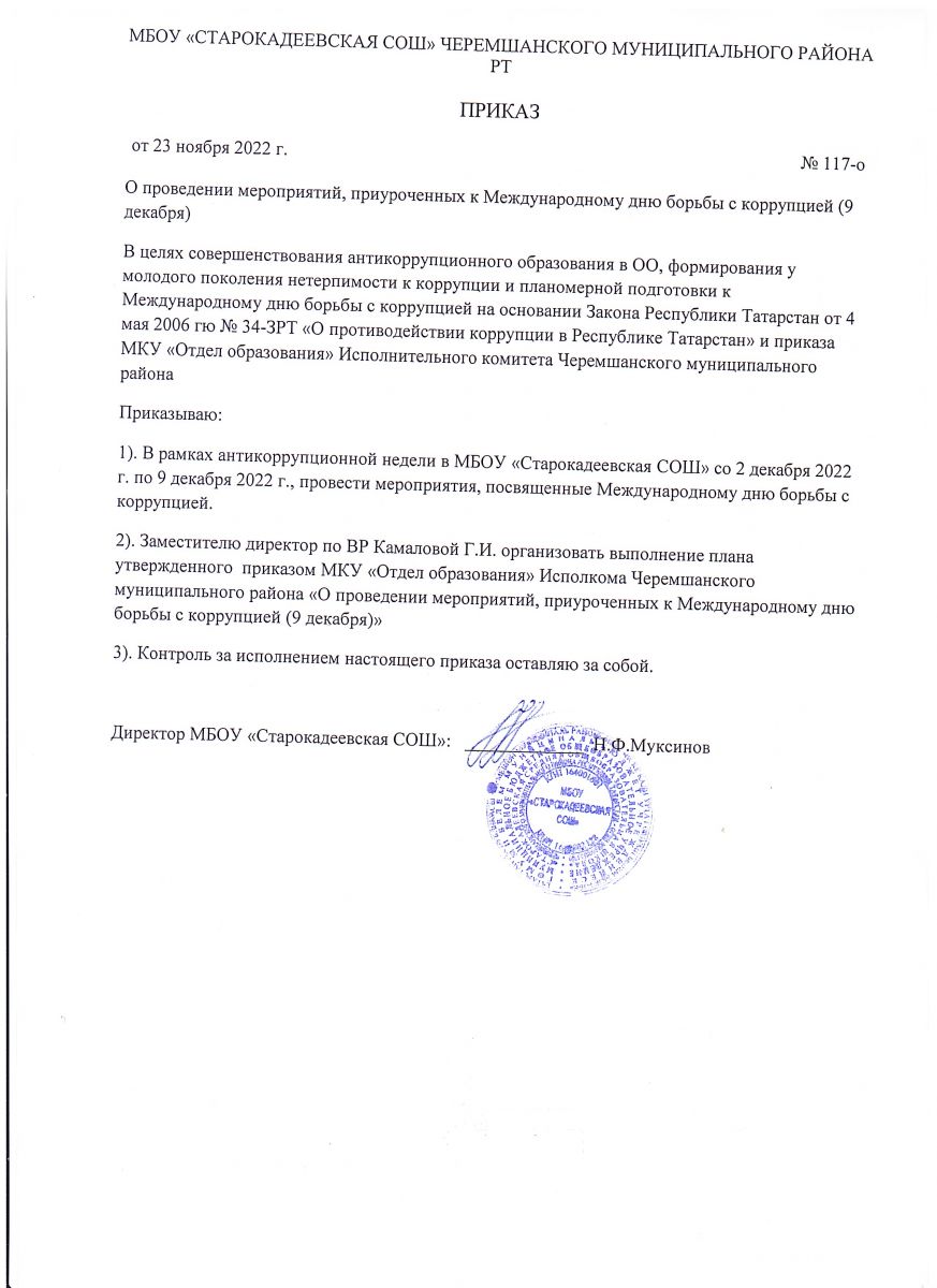 - Приказ МБОУ "Старокадеевская СОШ" от 31 октября 2012 года №41-о "О создании комиссии по предупреждению и профилактике коррупционных нарушений" (с планом-приложением).
