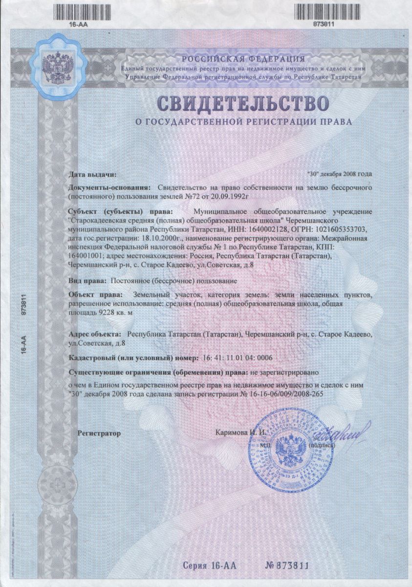 | Адрес: | 423117, Республика Татарстан, Черемшанский район, с. Старое Кадеево, ул. Советская, дом 8 |