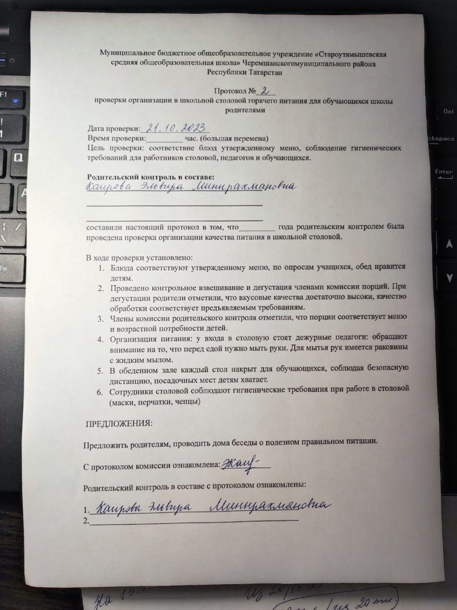 График проверки школьного питания МБОУ "Староутямышевская СОШ" родительским контролем.