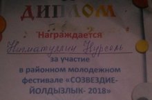 Воспитанник нашего детского сада Нигматуллин Нурсель принял участие в районном молодежном фестивале "Созвездие-Йолдызлык-2018". Нурсель был награжден Дипломом и прошел на второй тур.Молодец!!! Мы гордимся с тобой!!! Желаем успехов во втором туре!!!