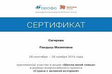 Туймәт төп белем мәктәбенең география укытучысы Сәгыйрова Л.М. "Страна с великой историей" бөтенроссия проектының "Школа моей семьи" акциясендә катнашты.