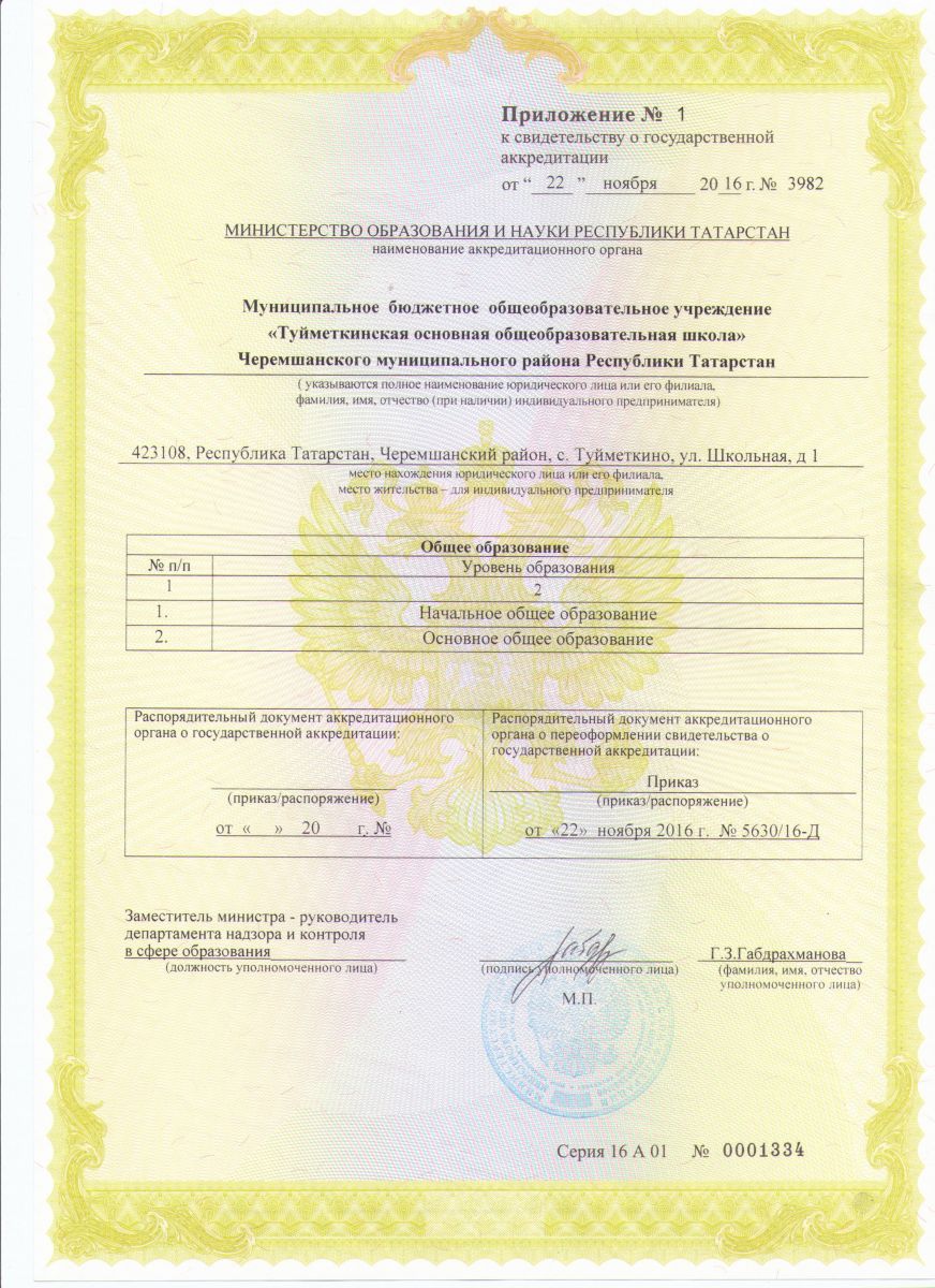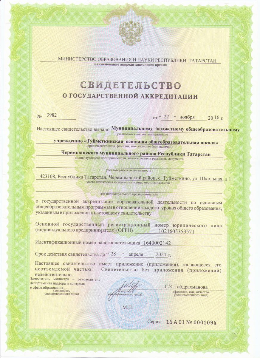 Свидетельство о государственной аккредитации МБОУ "Туйметкинская ООШ"