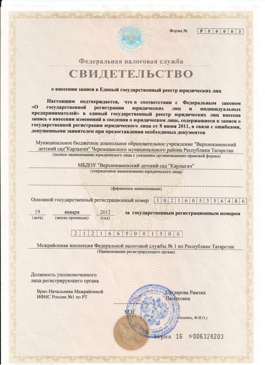 Короткое название: МБДОУ «Верхнекаменский детский сад «Карлыгач» Черемшанского муниципального района РТ
