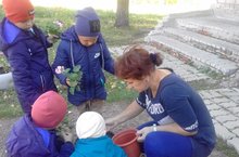 Ребята детского садика вместе с воспитателем и младшим воспитателем пересадили комнатные растения.