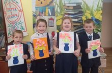 1 а сыйныф укучылары авыл китапханәсендә мастер-класста булдылар һәм үз әниләре өчен 3D открытка әзерләделәр.