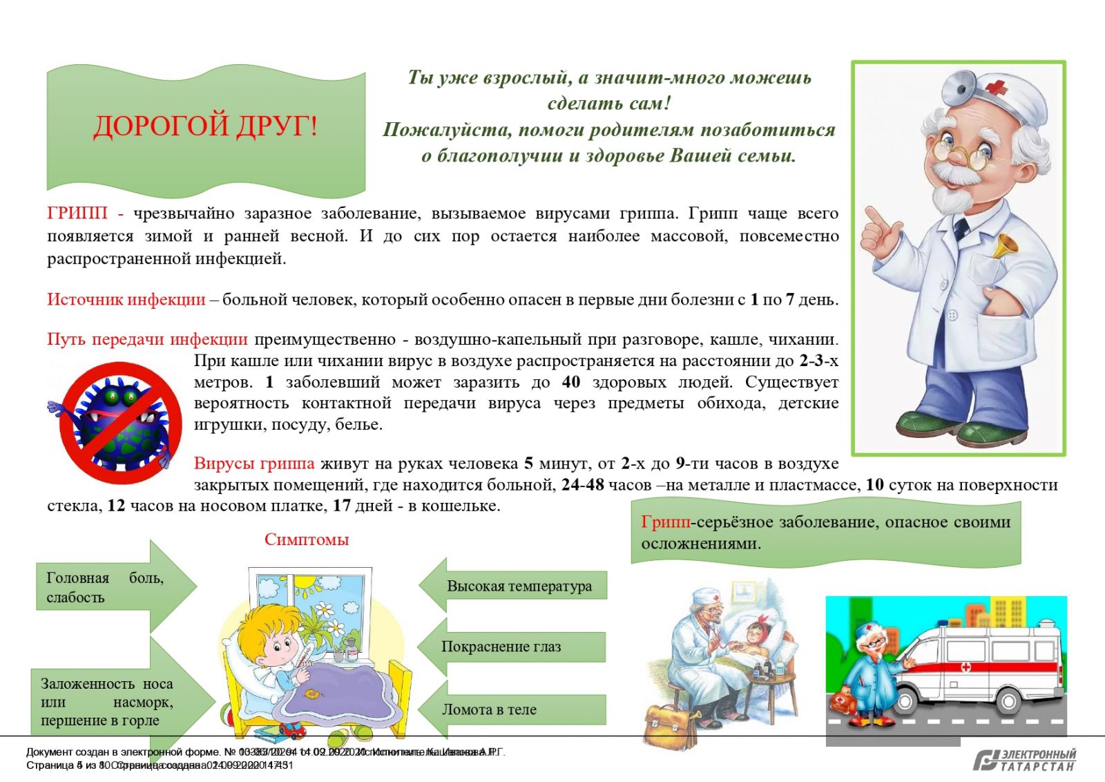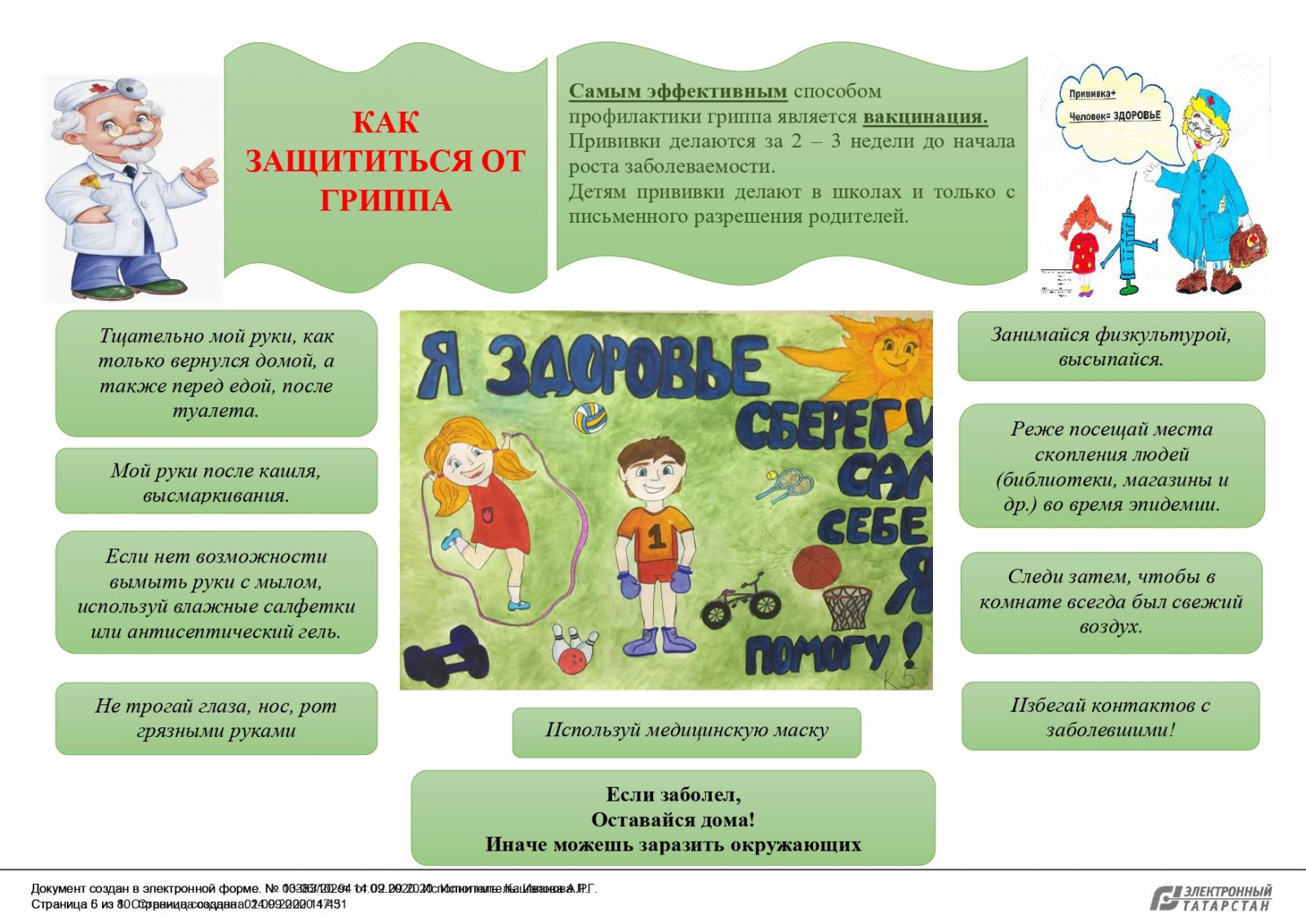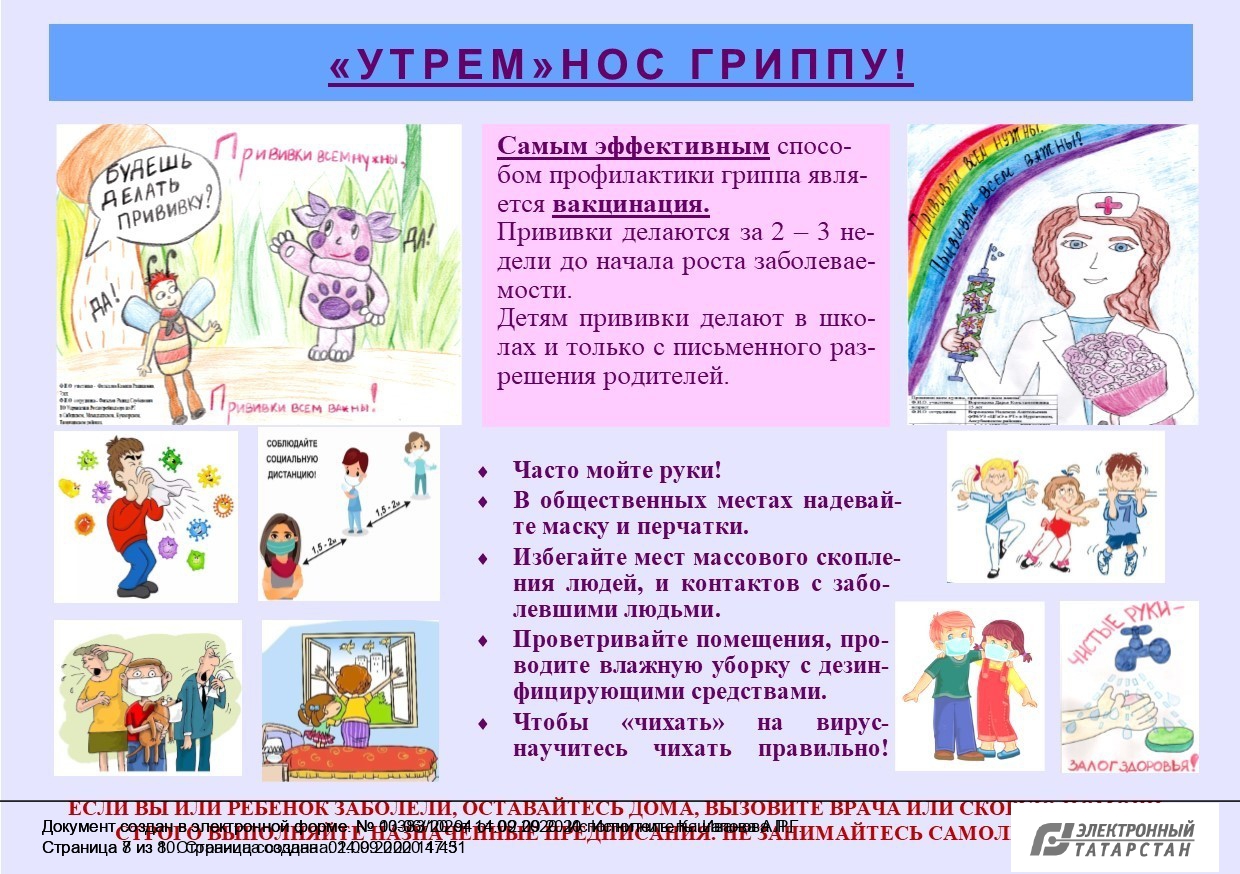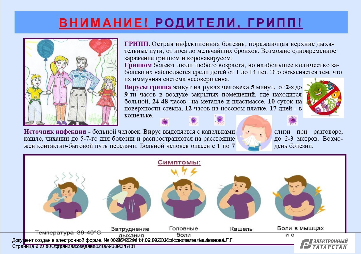 Опубликовано: 15.09.2020В целях усиления мероприятий по предупреждению заболевания гриппом и острых респираторных вирусных инфекций среди населения Республики Татарстан, в том числе новой коронавирусной инфекции (COVID-19), специалистами ФБУЗ «Центр гигиены и эпидемиологии в Республике Татарстан (Татарстан)» разработаны памятки о мерах профилактики гриппа.