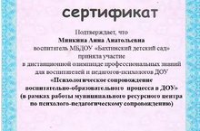 Участие в дистанционной олимпиаде профессиональных знаний для воспитателей и педагогов-психологов в ДОУ "Психологическое сопровождение воспитательно-образовательного процесса в ДОУ" 27.11.2020