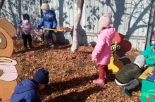Балалар участоктагы коелган яфракларны җыештылар. Дети на прогулке активно убирали участок.