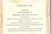 Диплом победителя 1 место поздравляем наших педагогов за победу Республиканском конкурсе развивающих предметно-пространственную среду ДОУ "Среда в среде" в номинации :"Центр патриотеческого воспитания."