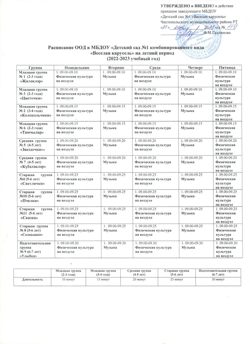 Расписание ООД на летний период на 2022-2023 учебный год