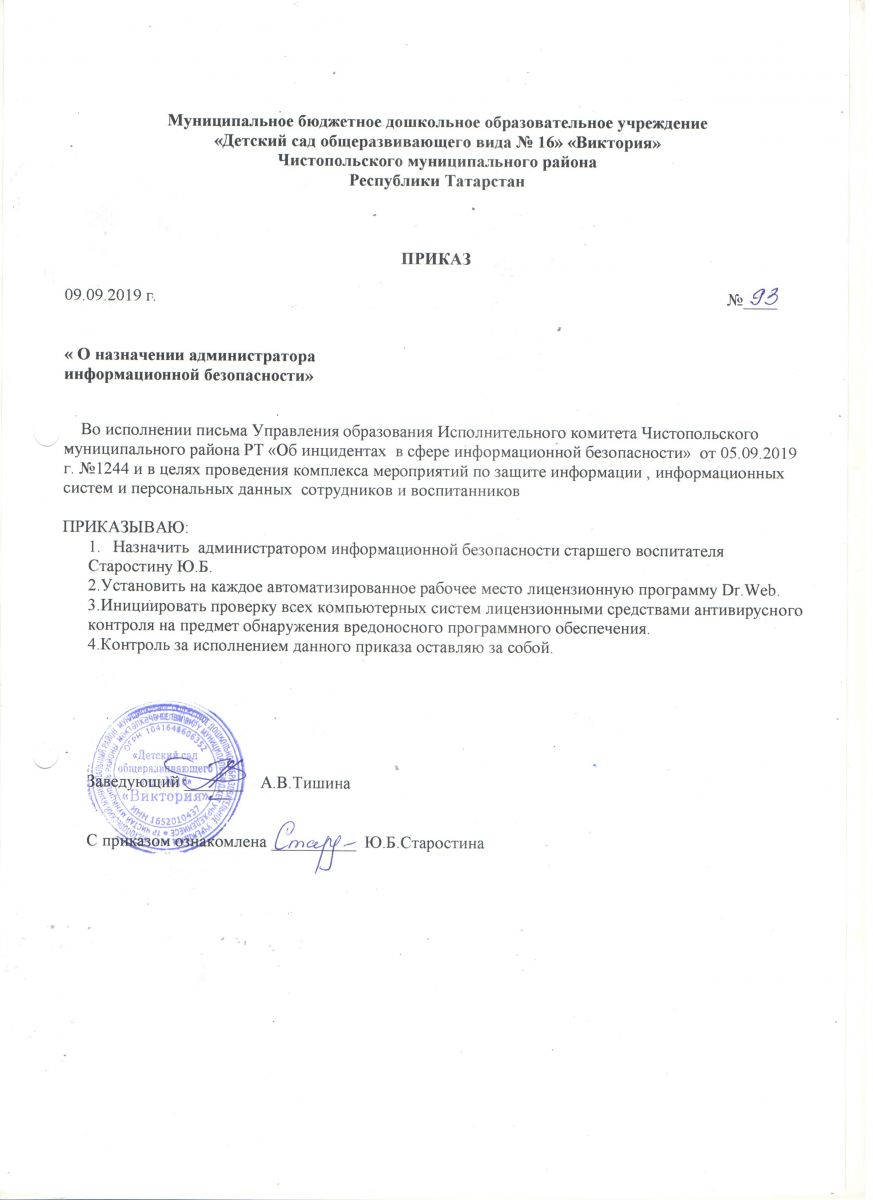 Приказ ДОУ "О назначении администратора по информационной безопасности"