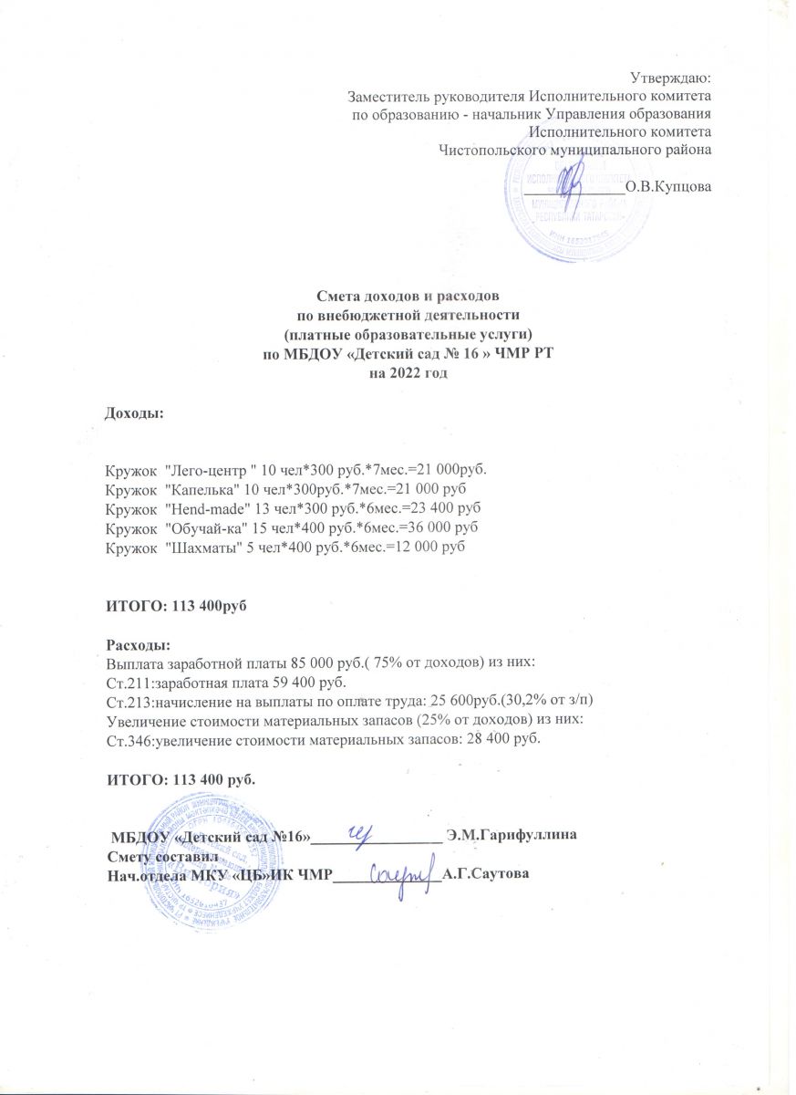 Смета доходов и расходов по внебюджетной деятельности по МБДОУ № 16