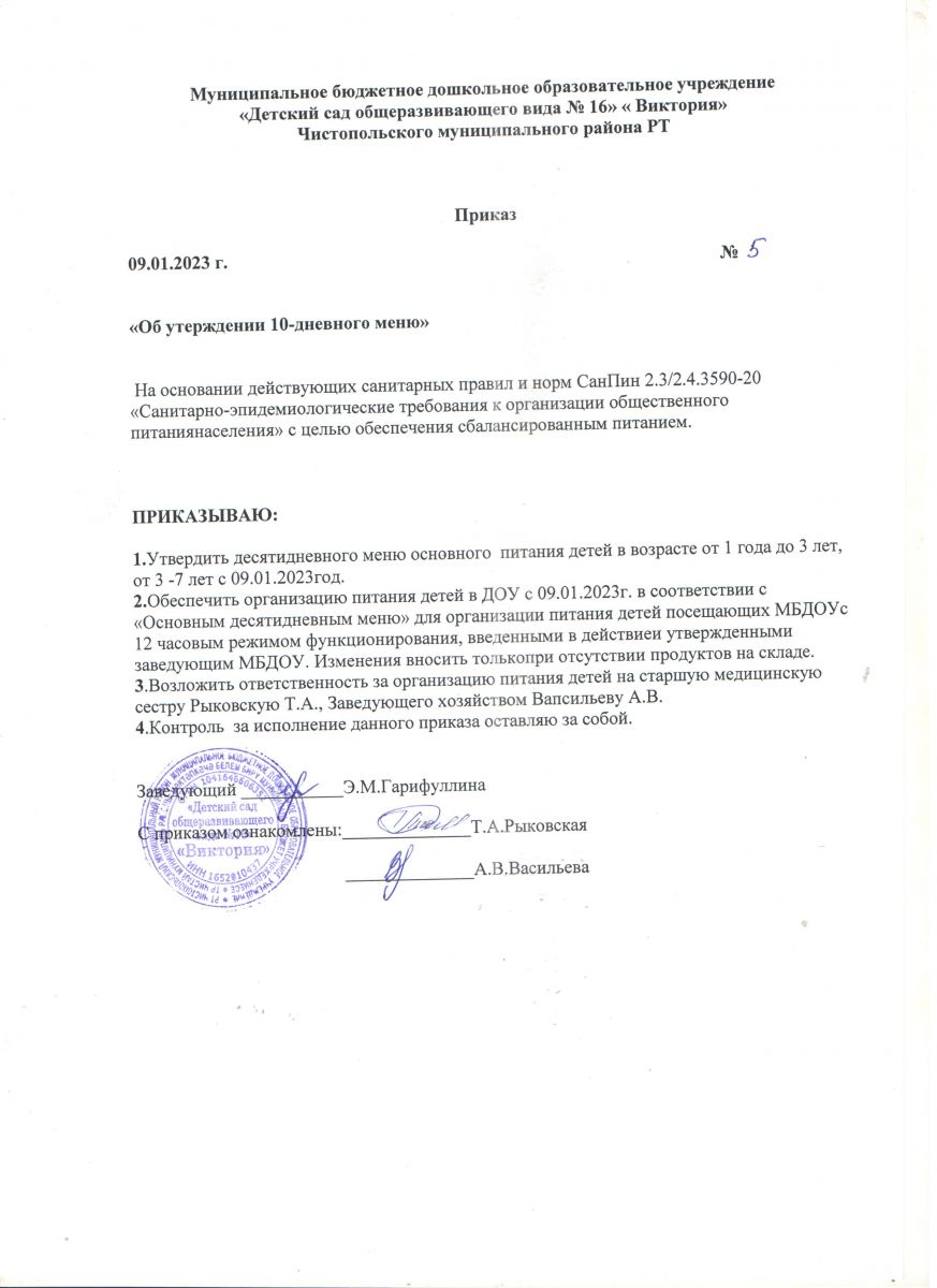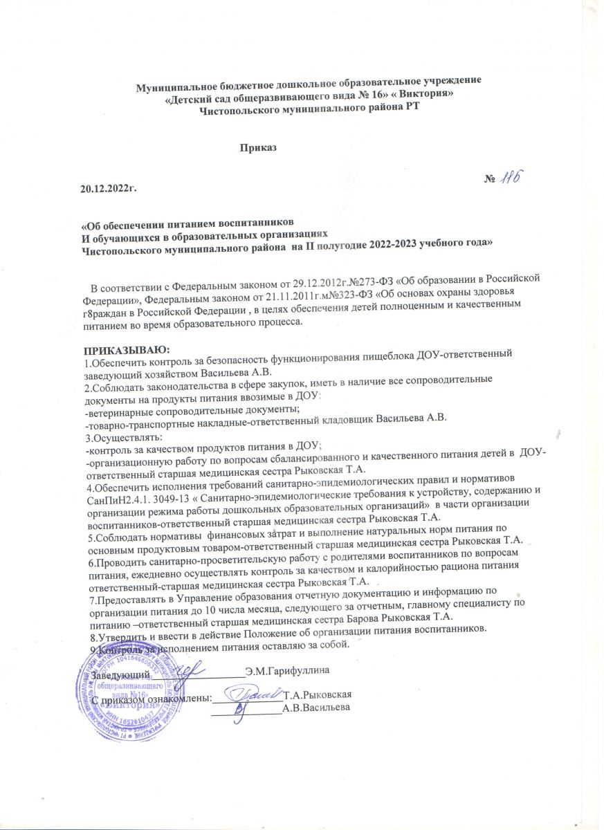 Приказ об обеспечении питанием воспитанников на 2 полугодие 2022 - 2023 учебного года