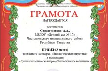 Педагог Сиразетдинова А.А. стала призером (3 место) зонального конкурса «Экологическая игротека» в номинации «Лучшая экологическая игра»- «Экологическое воспитание».Поздравляем!/Педагог Сираҗетдинова А.А. «Экологик китапханә» зональ конкурсының «Иң яхшы экологик уен»- «Экологик тәрбия»номинациясендә призер булды.Котлыйбыз!