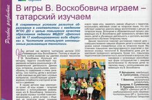 Наш детский сад является тьюторским центром ООО "Развивающие игры Воскобовича". В рамках Года национальных культур и традиций наши педагоги ДОУ опубликовали статью на тему «В игры В.Воскобовича играем -татарский изучаем» в федеральном журнале для родителей и педагогов «ДоШКОЛЬНЫЙ МИР»/ Безнең балалар бакчасы "В.Воскобовичның үсеш уеннарының тьютор үзәге булып тора.. Милли мәдәниятләр һәм традицияләр елы кысаларында ДОУ педагогларыбыз «В. Воскобович уеннарында татар телен өйрәнәбез» темасына «Мәктәпкәчә дөнья»ата-аналар һәм педагоглар өчен федераль журналында мәкалә бастырдылар