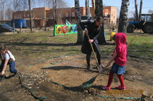 Дети подготовительной группы №4"Золотой ключик" с удовольствием помогают в уборке своего игрового участка