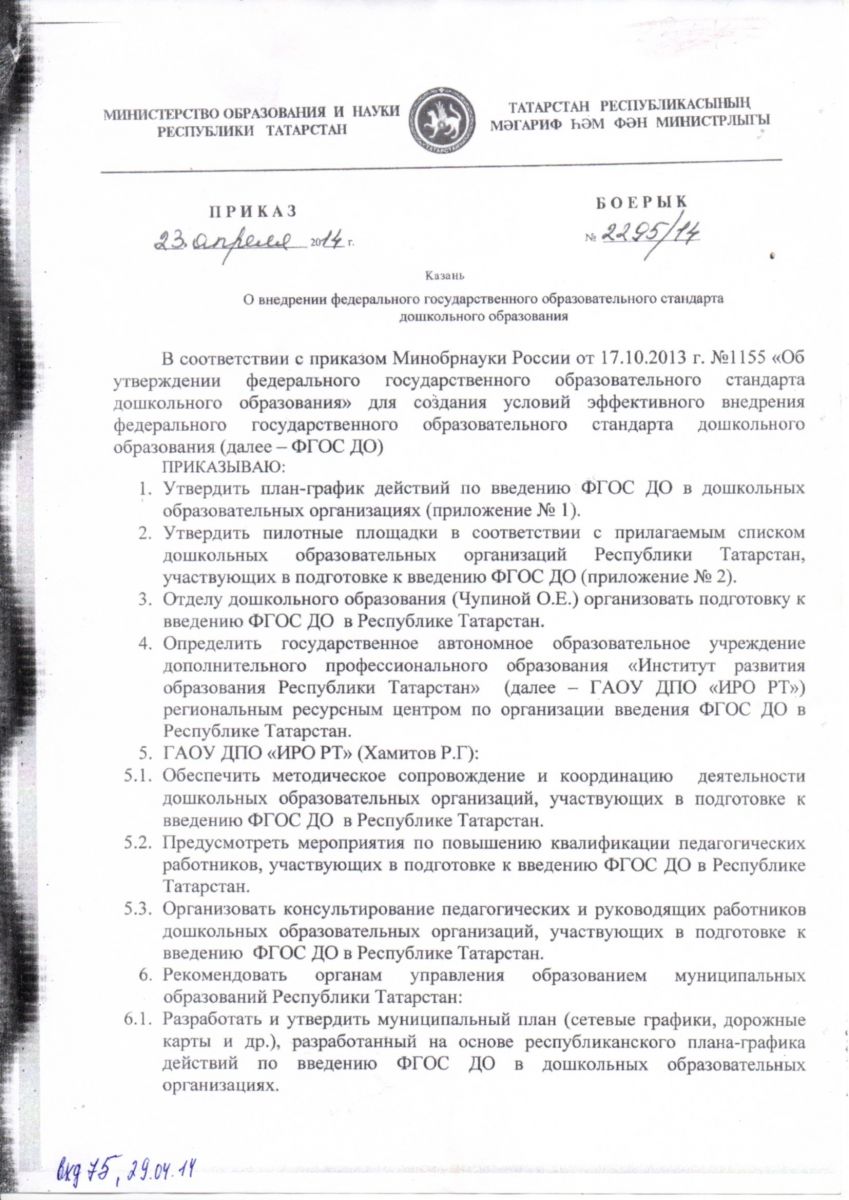 Приказ Министерства Образования РТ о внедрении ФГОС
