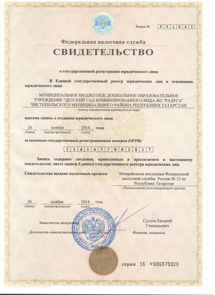 Свидетельства о внесении записи в Единый государственный реестр юридических лиц Серия 16 №006975029 выдано 26.11.2014 года Межрайонной инспекцией Министерства Российской Федерации по налогам и сборам № 12 по Республике Татарстан, основной регистрационный номер: 1141677001817, дата регистрации: 26.11.2014 года /Свидетельство о государственной регистрации юридического лица;