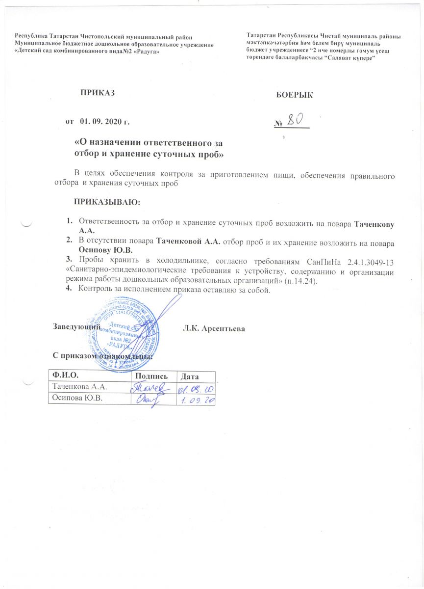 Приказ № 80 от 01.09.2020 "О назначении ответственного за отбор и хранение суточных проб"