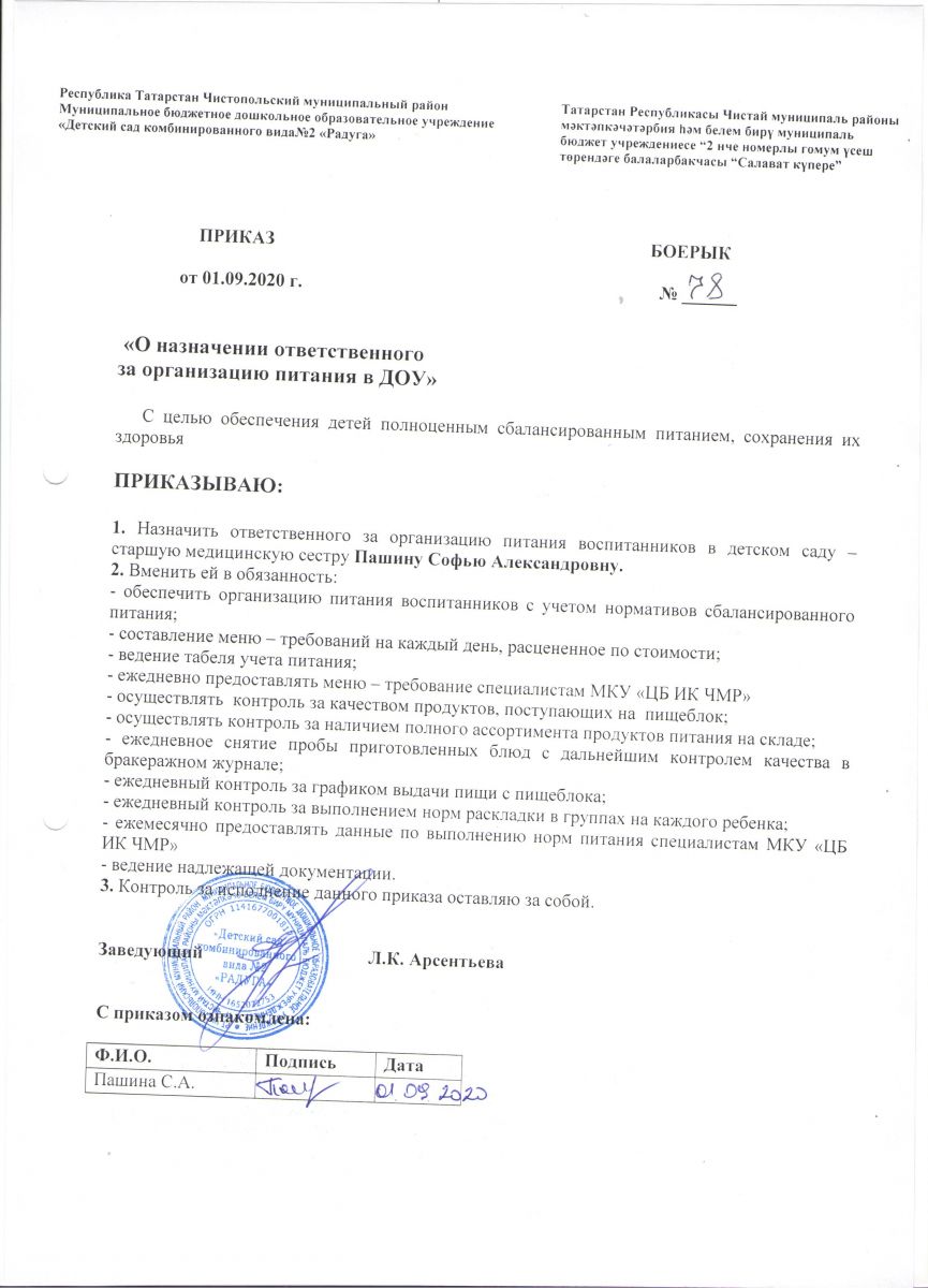 Приказ № 78 от 01.09.2020 "О назначении ответственного за организацию питания"