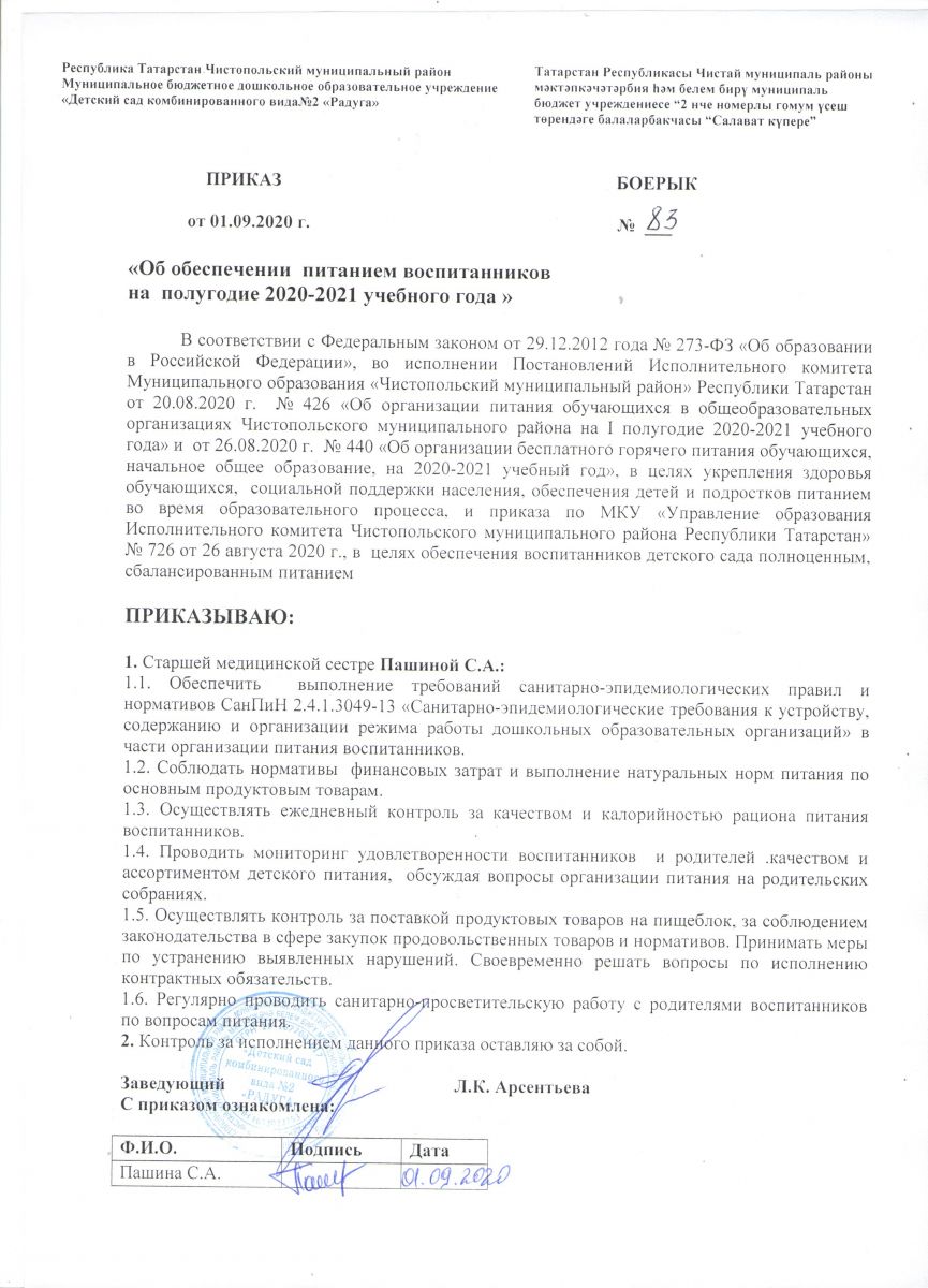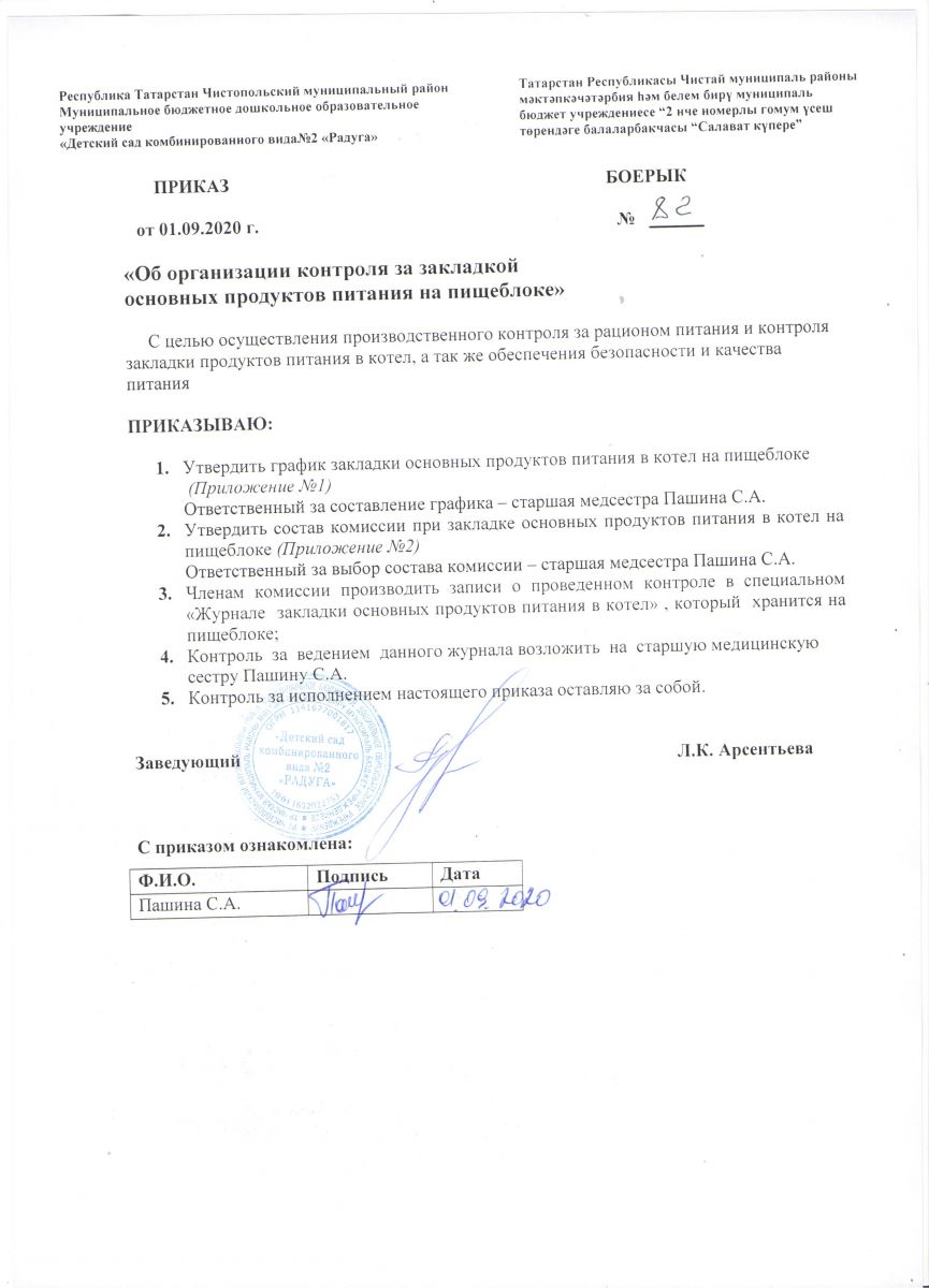 Приказ № 79 от 01.09.2020 "Об организации контроля за питанием в ДОУ"