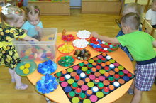 В рамках экологической акции «Полезные крышки» были изготовлены воспитателями совместно с детьми пособия для закаливания. С этой целью дети играли в игры: «Собери по цвету», «Разложи по цвету», «Большой маленький».