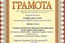 Өлкән яшьтәге мәктәпкәчә яшьтәге балалар арасында «Туган якны белүчеләр»муниципаль фәнни-гамәли конференциясе призеры Гарифуллин Азаматны котлыйбыз. Педагоглар Нуриев к.м. һәм Бузулуков р. м. тәрбияләнүчеләрне әзерләгәннәре өчен рәхмәт белдерәбез.