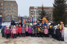 Балалар бакчасында тәрбияләнүчеләр Масленица бәйрәмен билгеләп үтү өчен спорт мәйданчыгында җыелдылар.Алар кышны күңелле үткәрделәр, димәк, ел буе бәхетле һәм уңышлы булачак!