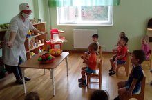 К деткам приходил их любимый сказочный герой- веселый и добрый доктор Айболит, он проверил у детей их здоровье, рассказал о пользе фруктов и овощей, дети играли с ним в интересные познавательные игры, отгадывали загадки и танцевали веселый танец " Танец маленьких утят".