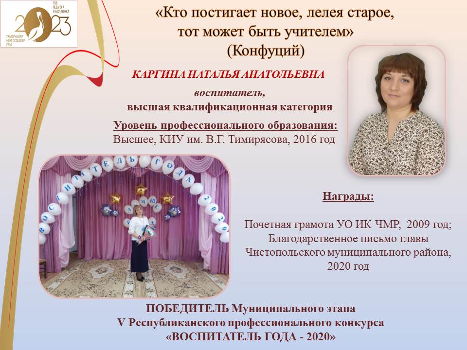 Каргина Наталья Анатольевна - воспитатель высшей квалификационной кагегории