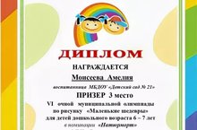 Подведены итоги VI очной муниципальной олимпиады по рисунку "Маленькие шедевры" для детей дошкольного взраста 6-7 лет в номинации "Натюрморт" в рамках МРЦ "В таланты с малых лет". Воспитанница нашего детского сада Моисеева Амелия приняла активное участие и заняла почетное 3 место. Педагоги: Романова Н.В., Софронова Е.А.