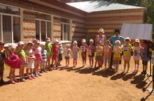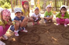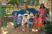 Знакомство воспитанников первой младшей группы с персонажами на территории детского сада. 01.07.2016