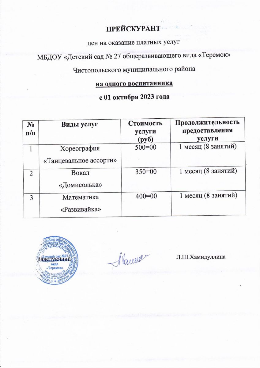 Прейскурант цен на оказание платных образовательных услуг на 2023-2024 учебный год