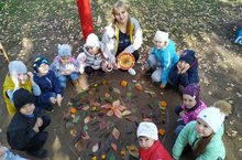 На осенних прогулках наши воспитанники учатся самостоятельно составлять цветочные композиции. В качестве исходного материала они используют не только отцветшие цветы, лепестки, но и декоративные растения, яркие листья, цветную бумагу. Воспитатель Ильдимирова Е.А. сделала на прогулке с детьми данмалы – мозаики из осенних листьев.
