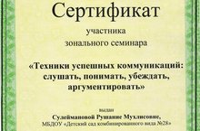 Педагоги Сулейманова Р.М., Ульянова Т.А. приняли участие в региональном семинаре для учителей – логопедов и воспитателей групп компенсирующей направленности ДУ по теме «Техники успешных коммуникаций: слушать, понимать, убеждать, аргументировать».