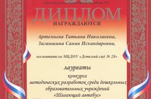 Воспитатели детского сада: Артемьева Т.Н., Егорова С.А., Зиганшина С.И., Предеина О.В. стали лауреатами конкурса методических разработок среди дошкольных образовательных учреждений «Шагающий автобус» и награждены дипломами, Приказ № 1055 от 28.08.2015. Ещё 14 педагогов получили сертификаты участников конкурса. Поздравляем коллектив с активным участием в муниципальном конкурсе. Молодцы!
