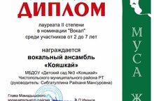 Поздравляем вокальный ансамбль "Кояшкай", призеров Республиканского конкурса среди детей "Красная ромашка"/"Кызыл ромашка", посвященный творчеству великого татарского поэта-героя Мусы Джалиля. Руководитель:Сибгатуллина Р.М. Желаем дальнейших успехов!