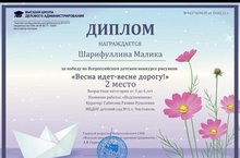 Поздравляем Шарифуллину Малику с призовым 2 местом во Всероссийском детском конкурсе рисунков "Весна идет - весне дорогу!"