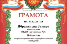Безнең тәрбияләнүче Ибраһимова Замира "SuperДетки" сәләтләренең ачык муниципаль турнирында катнашты һәм җиңүче булды! Горурланабыз! Шулай тотарга!