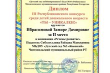 "Сөйлэм үстерү" номинациясендә мәктәпкәчә яшьтәге балалар арасында "Син - уникаль!" Республика конкурсында Ибрагимова Зәмирә II урын алды. Котлыйбыз!
