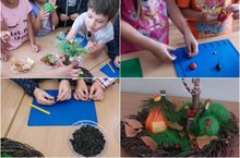 Осень-это славная пора,богатая интересными природными материалами: шишками,разноцветными цветами и листиками, осенние поделки из природного материала можно делать даже из фруктов и овощей! Природа- неиссякаемый источник творчества и вдохновения.Коллективная работа группы "Радуга"