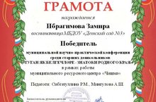 Поздравляем нашу воспитанницу Ибрагимову Замиру - Победителя муниципальной научно-практической конференции среди старших дошкольников "Туган як белгечләре-Знатоки родного края"
